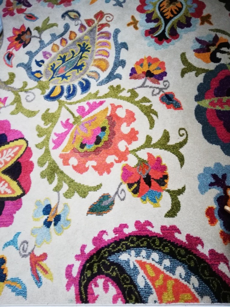 En discutant avec ma fille, elle m’a donné main libre sur la décoration, tant que tout n’était pas rose. Ayant libre cours et comme le tapis avait besoin d’être remplacé, j’en ai profité pour acheter un tapis Casablanca que j’aimais depuis quelques temps, et je ne savais pas où l’installer chez nous, avant cette opportunité. Ce tapis, plein de couleurs merveilleuses sur un fond crème est devenu mon principal point de départ pour la palette de couleurs de la pièce.