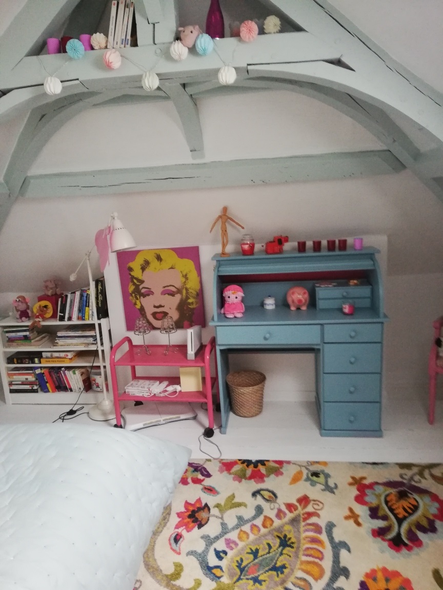 As all the wood furniture was bright pink I decided to paint this in blue to tone down the pink overkill my daughter had been living with for many years. I wanted to have different tones of the same blue, and for this Dulux Valentine paints are amazing. They do different series of monochromatic paint themes each year, and it is such a help not to make a mistake in matching the tones you want to use. For my daughter’s room I chose paints from their range called “Pacific Islands”. I used the medium paint, a lovely bright light blue, to paint the larger items of furniture, and the intense blue, to paint the smaller items. I also decided to use the lighter blue to paint the beams, to keep the space as spacey as possible.