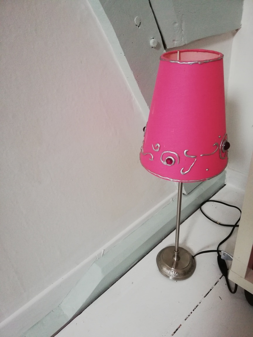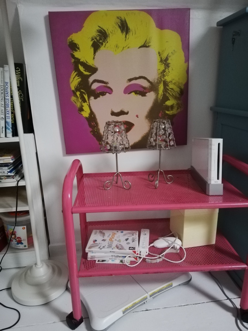 Mon premier point de départ était la tableau pop art de ma fille de Marilyn Monroe, principalement rose avec une touche de jaune. Elle l’a choisi bien des années auparavant, parmi d’autres affiches et objets pop art qu’elle possède désormais chez elle à Paris. Un autre objet est une table en métal sur roues, qui est rose vif. Je l’ai acheté il y a de très nombreuses années quand j’étais étudiant et je l’ai utilisé pour poser ma télévision dans mon logement d’étudiante à Twickenham! Il a été dans chaque maison depuis, dans une variété de pièces, jusqu’à ce qu’il se retrouve dans la chambre de ma fille comme support pour sa tablette multimédia pour regarder ses films préférés ou travailler dessus! Un autre article est un bel abat-jour orné de bijoux rose vif, acheté il y a de nombreuses années, mais toujours en très bon état.