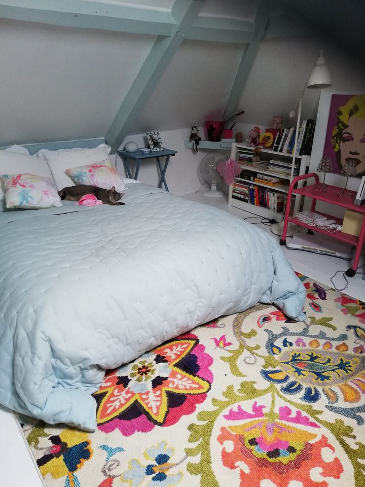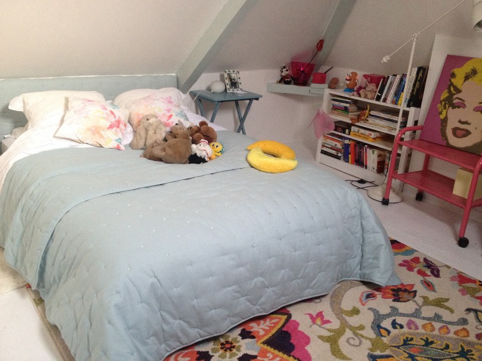 Le principal problème à résoudre était la tête de lit. Je ne pouvais pas en acheter un à cause de la hauteur du mur sous la pente, ils ne font tout simplement pas des têtes de lit aussi petites. J’ai donc acheté un morceau de bois coupé sur mesure, j’ai commandé de la mousse de literie en ligne et j’ai acheté un autre jeté de lit assortie à La Redoute. En utilisant du ruban adhésif double face (le type que vous utilisez pour poser un sol en lino), j’ai collé la mousse sur le bois, que j’avais découpée à la bonne taille avec un couteau électrique. J’ai ensuite tiré le jeté de lit très serrée et j’ai utilisé une agrafeuse pour l’attaché au bois et recouvrir la mousse, et voilà … une nouvelle tête de lit ajustée et assortie.