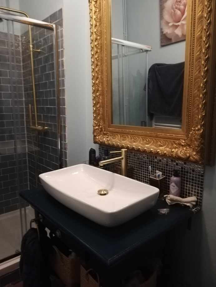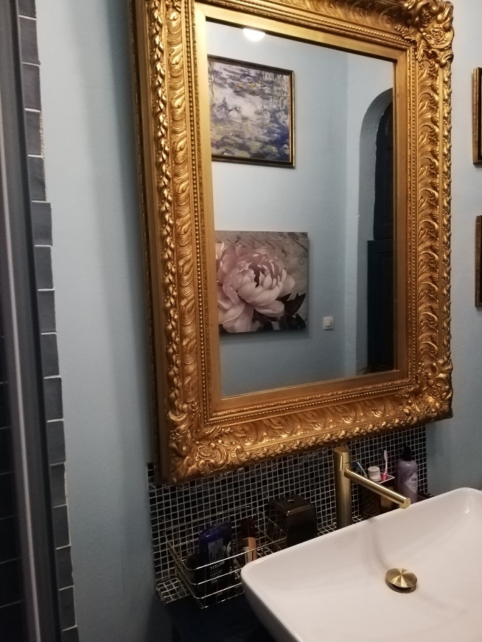 Still thinking this through, and whilst visiting an antiques fair, I saw an amazing antique gold mirror… One of those “it’s going to break the bank but I have to have it” moments, followed by “where am I going to put this” … After stowing my new purchase carefully in the car, followed by enjoying a Kir Royale at a local Café …I had another Eureka moment … The gold mirror would add warmth to my blue shower room … It would be perfect. Also, because the mirror was huge and ornate, it would play on my late 19th century drama that I was creating!