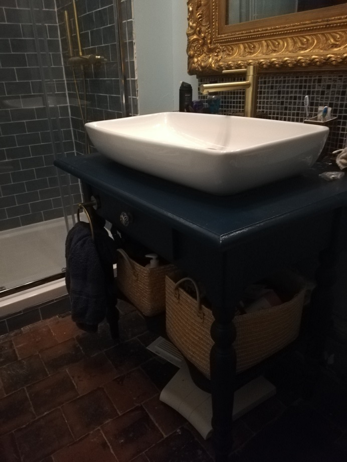 Ensuite, j’avais besoin d’un comptoir pour poser ma vasque à poser … J’ai cherché et cherché mais rien ne me semblait bien pour la pièce … Jusqu’à ce que lors d’un autre salon d’antiquités, j’ai trouvé une vieille console en pin avec des “jolies pieds” une bonne affaire à 15 euros, que J’ai négocié à 10! … J’ai adoré la forme des pieds sculptés, même s’il s’agissait d’une console en bois de pin de couleur orange des années 1990, cela se réparait facilement, je l’ai peinte dans le bleu canard pour correspondre au plafond … Et parce que les petites détails comptent … J’ai remplacé le bouton de tiroir en bois par un bouton en porcelaine blanche et bleue … Autre astuce, chaque fois que je vais dans des foires d’antiquités ou des magasins de meubles, je prends toujours mon carnet de notes, où j’ai noté toutes les mesures de mes pièces, avec moi … cela évite d’acheter les objets qui sont trop grand ou trop petit …