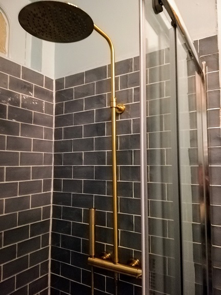 To go with the mirror I decided to have gold taps and accessories, this would add to creating a warm feeling in the blue bathroom, it is all a question of proportion and dosing in a west facing room with zero direct sunlight. Thinking about the tiles for the shower and the basin splashback I decided to stay in the blues for a feeling of harmony. Although to highlight the tiles I chose a mid blue to balance my dark and light blue ceiling and walls.