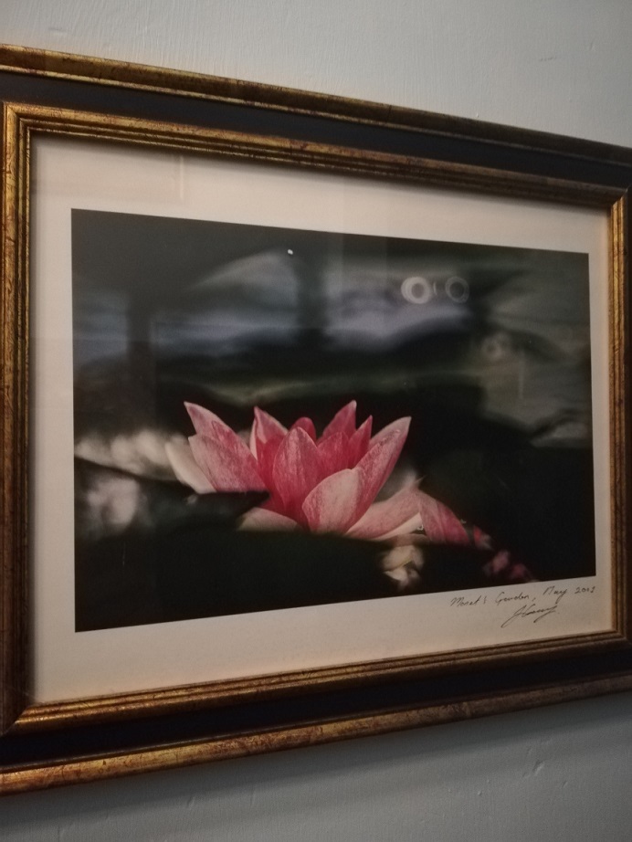My inspiration came during a visit to Monet’s garden in Giverny with my cousin Kim. The flowers and all the colour was amazing, taking many photos, I printed out a couple of my photos and framed them. Also Kim bought me a poster of the Lily pond as a souvenir, so I framed this as well. Next I found 2 lovely paintings of pink flowers … So I was all set … I had my shower room art gallery.