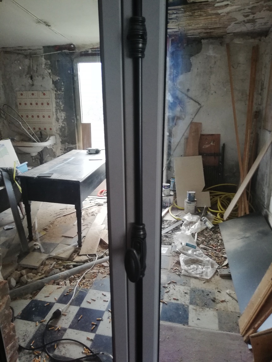 <Thinking again I started looking at the passage way from the main entrance hall that connect the original falling down bathroom exntension to the house. The passage way was going to be redundant as I planned to dmeolish the old bathroom to create a nice west facing terrace behind the house, where I imagined supping champagen and watching the glorious sunsets! Talking about champagne, during lock down, I have found and amazing company that delivers champagen to your door called Plus de Bulles, if you need stocks for Christmas, here is the link, I highly recommend them: https://www.plus-de-bulles.com/