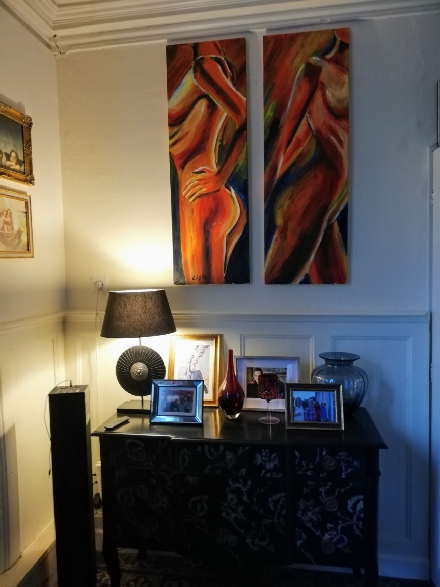 She does do commissions and the luxury of a colour coordinated picture to finalise your decorating scheme is an incredible decorating touch, and does not have to break the bank! .. Unless you buy a Monet or Picasso of course.. Which I certainly will never be able to do! I really enjoy going to the Louvre, Musée d’orsay, and the Musée Marmaton in Paris, and spend many hours enjoying the art, however in my own home, a painting by my cousin, or my children, is worth far more to me than a painting by a master!
