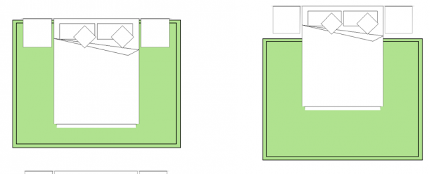 In the bedroom the rug should be large enough to extend beyond the sides of the bed at least 30cm for a twin or double bed, and at least 45 cm for a queen or king. You can go bigger, but these numbers should be the minimum you want to look for. Choosing a rug that’s too small for a large bedroom will throw the space off balance. If you do choose a large rug that fills up most of the room, leave at least 20 cm of space between the edges of the rug and the walls. Regardless of the size of your bedroom or bed, a rug should not push up against the edge or legs of a chest of draws or other large piece of furniture. Choose a rug that’s large enough to fully slip underneath the front legs of the dresser. Or, pick an area rug small enough so that you can leave at least two inches or three inches of floor showing between the edge of the rug and the piece of furniture.