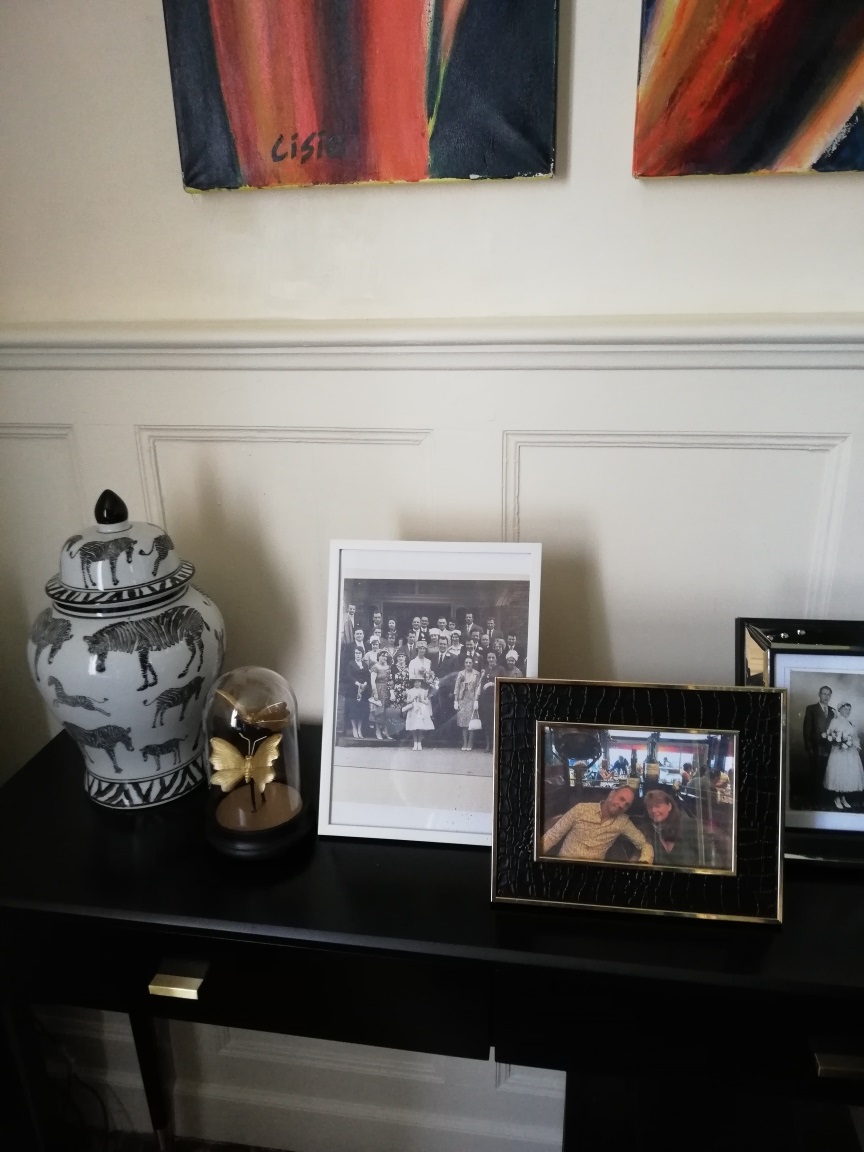 La dernière pièce de mobilier était une table console noire étroite sur laquelle mettre mon pot de gingembre noir et blanc, avec quelques photos, elle remplit parfaitement un coin et un espace entre la porte de la pièce qui serait vide sans cela.