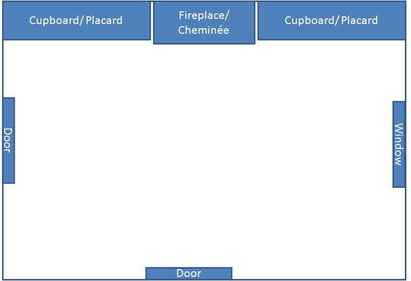 Next looking at the room space and layout I realized that it was not an easy space to work with due to 2 walls with central doors, and a whole wall taken up with a marble fireplace and original wood cupboards that would be sacrilege to take out … The central doors were the biggest pain, they cut the walls in 2 making it very difficult to place large pieces of furniture …