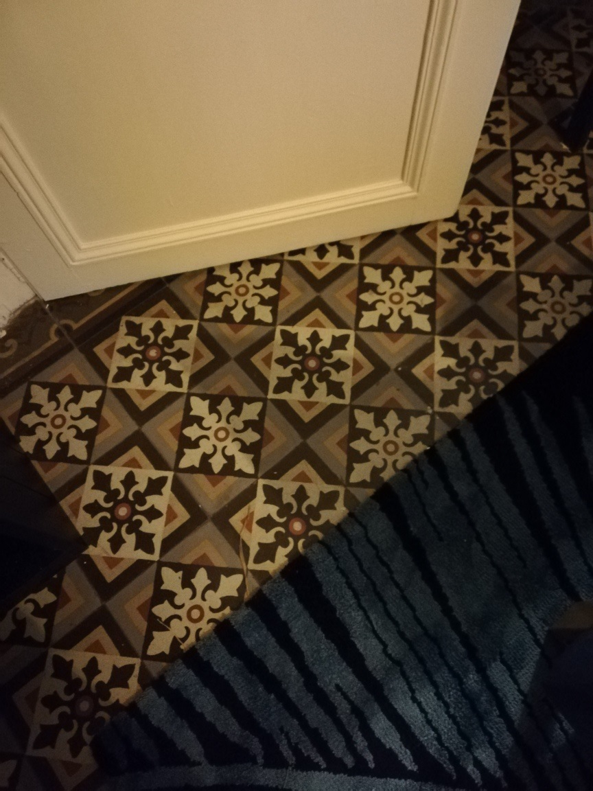 Ensuite, j’ai regardé les caractéristiques architecturales, et ici c’était le jackpot! J’avais une belle cheminée en marbre du 19ème siècle, typique de ce style de maison, et malheureusement si souvent arrachée dans les modernisations zélées des années 1970, il y avait même le panneau de miroir encadré d’origine au-dessus de la cheminée … J’avais aussi les armoires en bois d’origine de chaque côté de la cheminée… Et puis il y avait le sol, un carrelage original peint à la main… avec de belles boiseries en forme de demi-boiseries et de belles portes anciennes!