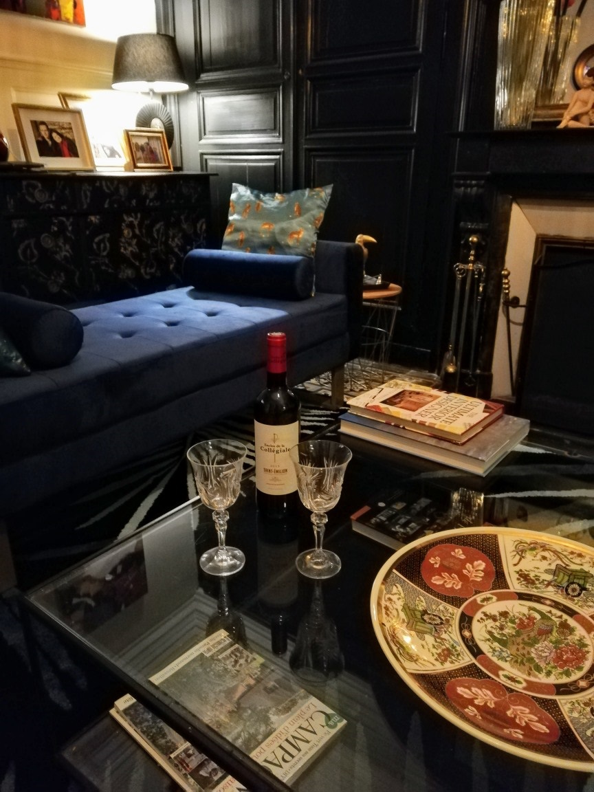 My low table, or coffee table, was again vital to my pre-dinner drinks. I wanted a very large table, as I like to go to town on the nibbles and bring the bottles out so people can top themselves up … Not wanting to visually eat up too much space I finally chose a glass table on a black metal frame … it is a piece I love, and the centre of many wonderful evenings spent with friends in front of a roaring fire.